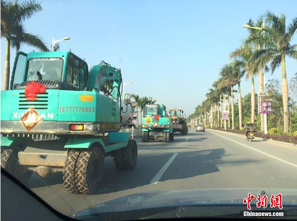 2015年1月1日是元旦。中国人都讲求一个吉祥,希望在新的一年里面能够有一个新的开始,所以很多的新人都希望在这新一年的第一天与自己相爱的人来走进婚姻的殿堂,共同的去面对未来的幸福时光。下面这组图一定会让您大吃一惊。一组挖掘机仪仗队缓缓前进,迎接那一对新人进入爱的殿堂。1月1日上午,广西钦州市金海湾大道,由几辆大型挖掘机组成的迎亲队在霸气巡街。